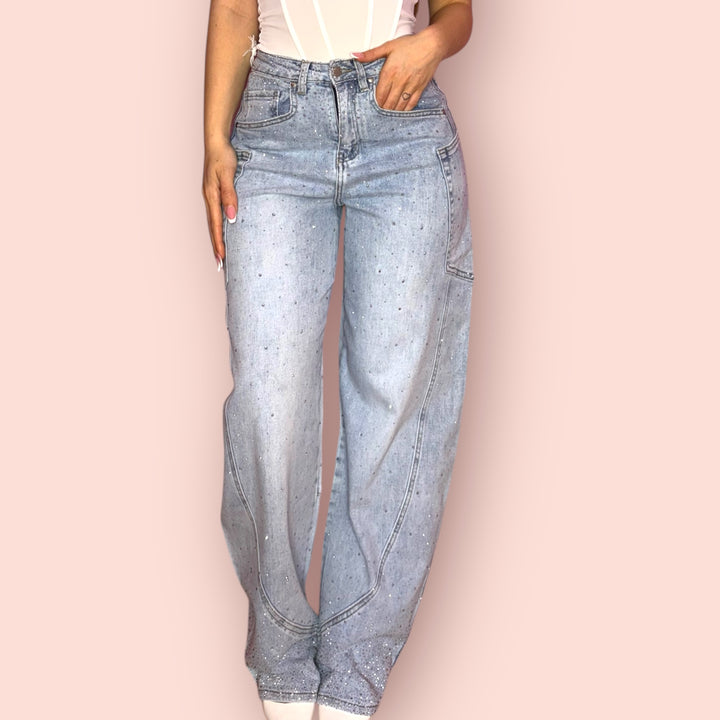 - Dettagli in strass lungo tutta la gamba e sull’orlo