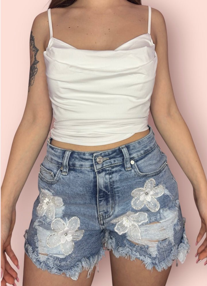 • Dettagli: Fiori in pizzo bianco cuciti a rilievo